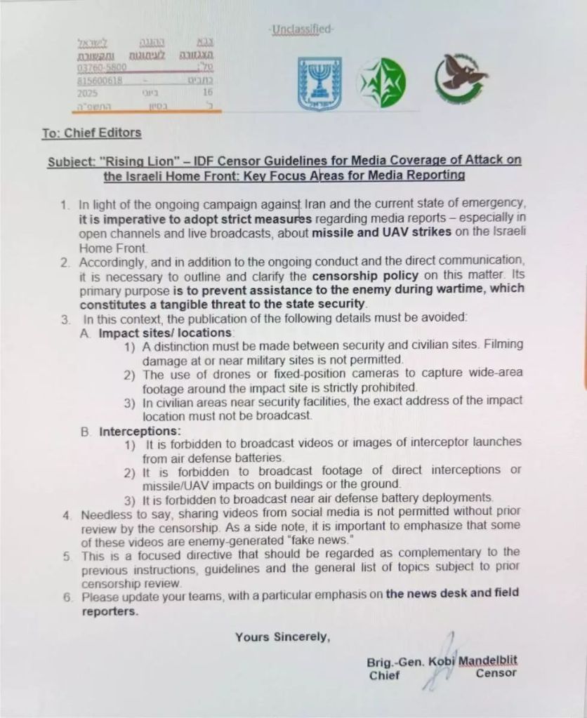 در بیانیهای که در ۱۶ ژوئن ۲۰۲۵ به اتاقهای خبر اسرائیلی و بینالمللی فعال در اسرائیل ارسال شد، سانسورچی ارشد ارتش اسرائیل محدودیتهای گزارشدهی را با هدف «جلوگیری از کمک به دشمن در زمان جنگ» مشخص کرد.