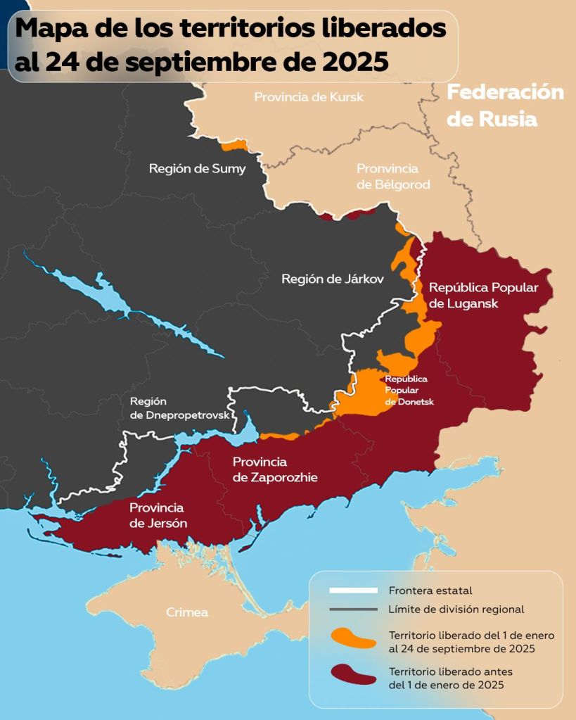 هفته گذشته، ژنرال والری گراسیموف، رئیس ستاد کل نیروهای مسلح و معاون اول وزیر دفاع روسیه، وضعیت کنونی جبهه را ارزیابی کرد و تأکید نمود که نیروهای این کشور «عملاً در تمامی جهات در حال پیشروی هستند.» علاوه بر این، وزارت دفاع روسیه روز پنجشنبه اطمینان داد که نیروهای مسلح این کشور بیش از ۴۷۱۴ کیلومتر مربع را در منطقه عملیات ویژه نظامی، بین ۱ ژانویه تا ۲۵ سپتامبر ۲۰۲۵، «آزاد» کردهاند.