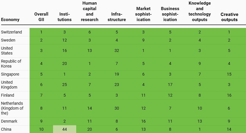 زیر ستون «نهادها» نمونۀ روشنی از این تعارض است. تمامی شش شاخص آن یا وابسته به قضاوت ذهنیاند و یا از مجموعههای شاخصهای ترکیبی جهانی گرفته شدهاند، و چین دقیقاً در همین بخش به رتبهای پایینتر از ۳۵ سقوط کرده است؛ در حالی که در عرصههای فناورانه و نوآوری خوشهای به سرآمدی جهانی رسیده است. به این معضل باید خطاهای دیگری را افزود: سوگیری به نفع اقتصادهای کوچک که با اندک میزان سرمایهگذاری خارجی یا ورود دانشجوی بینالمللی، درصدهای چشمگیر به دست میآورند؛ یا برعکس، فشار منفی بر اقتصادهای بزرگ که حجم عظیم تولید ناخالصشان نسبتها را به ظاهر کاهش میدهد. نمونه آن، «جریان خالص سرمایهگذاری خارجی» یا «سهم دانشجویان خارجی در آموزش عالی»، که چین را به رتبههای نزدیک به صدم تنزل داده، بیآنکه بازتابی واقعی از ظرفیت نوآوری این کشور باشد.