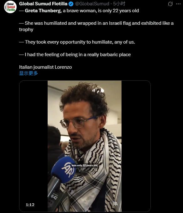 «لورنزو آگوستینو»، خبرنگار ایتالیایی، به رسانهها گفت: «تونبرگ تنها ۲۲ سال دارد. او مورد تحقیر قرار گرفت، در پرچم اسرائیل پیچیده شد و مانند یک جام پیروزی به نمایش در آمد. آنها [ارتش اسرائیل] از هر فرصتی برای تحقیر هر یک از ما استفاده کردند. در آن لحظه احساس کردم در مکانی وحشیانه قرار دارم.»