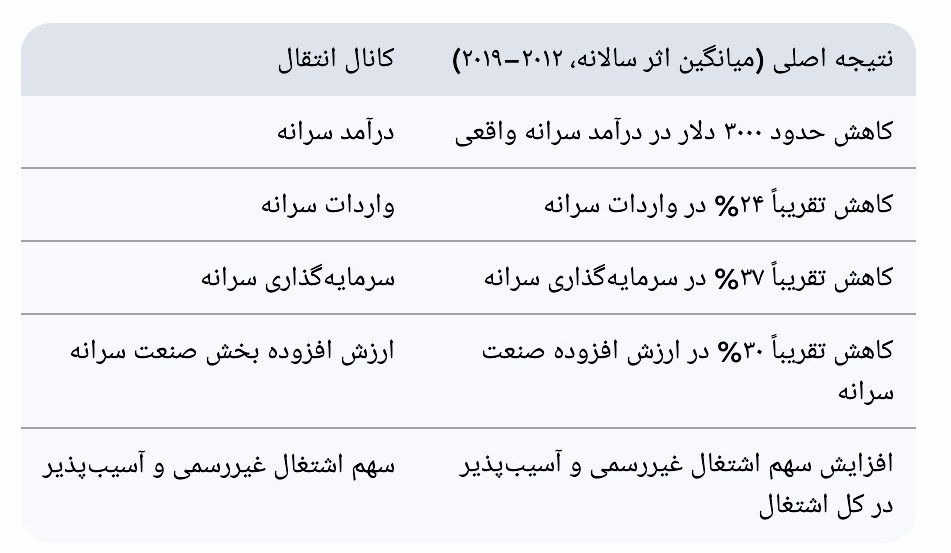 نویسندگان با صراحتی تحلیلی، اذعان میدارند که اثر تحریمها تنها محدود به شوکهای مستقیم اقتصادی نیست که از جانب غرب تحمیل میشود (مانند کاهش صادرات نفت و انزوای سیستم مالی). بلکه این تأثیر گسترهای کلانتر دارد و شامل پاسخهای سیاستی درونزای دولت ایران در مواجهه با فشار بیرونی نیز میشود. این پاسخها، که شامل تغییر ساختار هزینههای داخلی به سمت اولویتهای غیرمعیشتی، گسترش شبکههای پرفساد دور زدن تحریم، و تقویت بیرویهٔ نقش نهادهایی چون سپاه پاسداران در تسخیر اقتصاد است، خود بخشی جداییناپذیر از زنجیرهٔ علّی تحریمها هستند. بدین ترتیب، تحلیل آنها موفق به ثبت «اثر کلّی» و تمامعیارِ این کارزار تحریمی شده است.