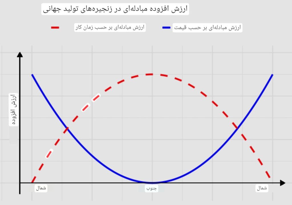 تقسیم کار نوین بینالمللی نه فقط در قالب زنجیرههای تولید جهانی، بلکه در قالب زنجیرههای ارزش جهانی نیز تجلی مییابد. در این زنجیرههای ارزش جهانی، ما بار دیگر با شکل دوگانهٔ سنجش ارزش مبادله مواجه میشویم که در سطح جهانی بسط یافته است. از یک سو، شکلگیری قیمتهای بازار جهانی را داریم، و از سوی دیگر، ارزش مبادله کالا که با زمان کار اجتماعاً ضروری موردنیاز برای تولید آن سنجیده میشود. مورد اخیر را میتوان بهصورت قیمت کار – یعنی دستمزد ساعتی – کمیسازی کرد. در این سرمایهداریِ روزبهروز جهانیتر، وضعیتی پدید آمده است که در آن، قیمت کالاها تمایل به جهانیشدن دارند، بهجز یک کالا: نیروی کار، که قیمت آن بین جنوب و شمال جهانی تقریباً با نسبتی معادل ۱ به ۱۰ تفاوت میکند.