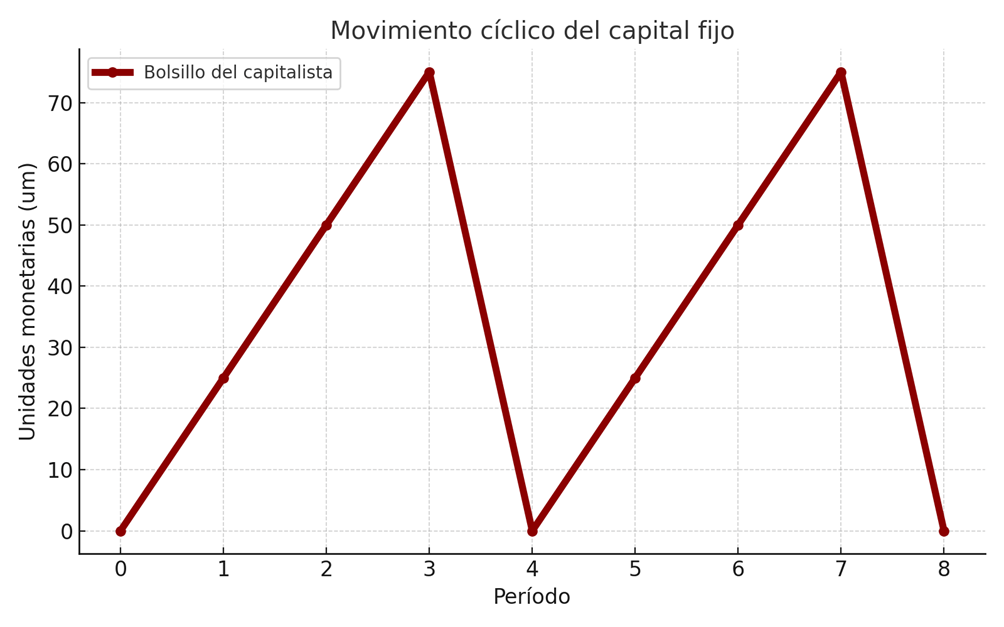 همانطور که مشاهده میشود، «جیب» سرمایهدار (حساب بانکی)، در ارتباط با حرکت سرمایهٔ ثابت خود (بدون توجه به آنچه برای سایر عناصر سرمایهٔ مولد رخ میدهد) و بدون احتساب پیشپرداخت اولیهٔ ۱۰۰ واحد پولی، مقادیر زیر را کسب میکند که تکرار خواهند شد: ۰، ۲۵، ۵۰، ۷۵، ۰. این حرکت دارای دو بخش است: ۰ تا ۷۵ که انبساط است و ۷۵ تا ۰ که بحران است.