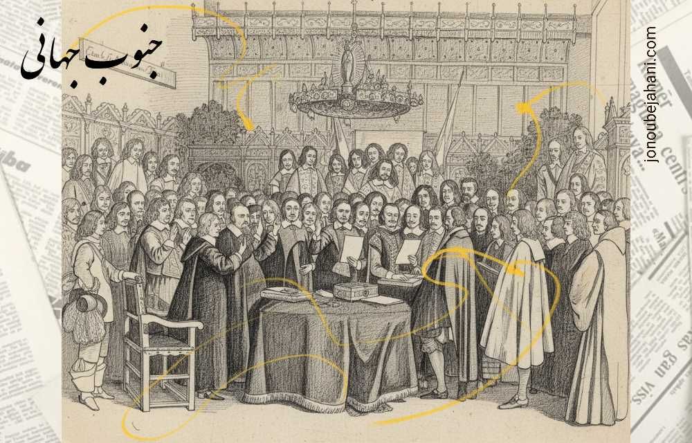امضای پیمان مونستر در مه ۱۶۴۸، نشاندهنده پایان جنگ سی ساله اروپا و جزء مهمی از نظام وستفالی است. تصویر از: هرارد تِربورخ، نقاش هلندی (۱۶۱۷–۱۶۸۱)