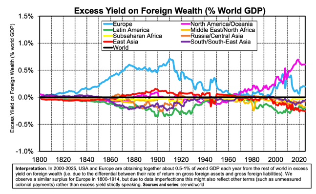 در حالی که تحلیل آنان از حساب جاری در دومین جهانیسازی عمدتاً پشتیبان این ایده است که جهان اکنون، از زمان پایان استعمار، تا حدی عادلانهتر شده است، نیواس و پیکتی به یک منبع حیاتی قدرت ایالات متحده در عصر ما اشاره میکنند و آن «امتیاز گزاف» آن است: آنان مشاهده میکنند که کشورهایی که ارز مسلط و مؤسسات مالی پیشرو آن زمان را کنترل میکنند، میتوانند با نرخهای پایینتر استقراض کنند و بازدههای بالایی از سرمایهگذاری خارجی خود به دست آورند و از این طریق درآمد اضافی قابل توجهی کسب کنند. نیواس و پیکتی این را «بازده اضافی» مینامند (به دلیل اختلاف نرخ بازدهی داراییهای ناخالص خارجی و بدهیهای ناخالص خارجی) و بخشی از نوآوری مجموعه دادههای آنان این است که میتوانند این میزان را از سال ۱۸۰۰ تا ۲۰۲۵ برآورد کنند (به نمودار زیر مراجعه کنید). این امر روشنگر است، زیرا اکثر بحثها و برآوردهای مرتبط با امتیاز گزاف تا به امروز به دورهٔ پس از دههٔ ۱۹۷۰ محدود شده است.۷ جالب توجه است که یافتههای آنان نشان میدهد که بازده اضافی اروپا در دورهٔ ۱۸۰۰ تا ۱۹۱۴ از نظر اندازه با بازده اضافی ایالات متحده در دورهٔ ۱۹۷۰ تا ۲۰۲۵ قابل مقایسه است.