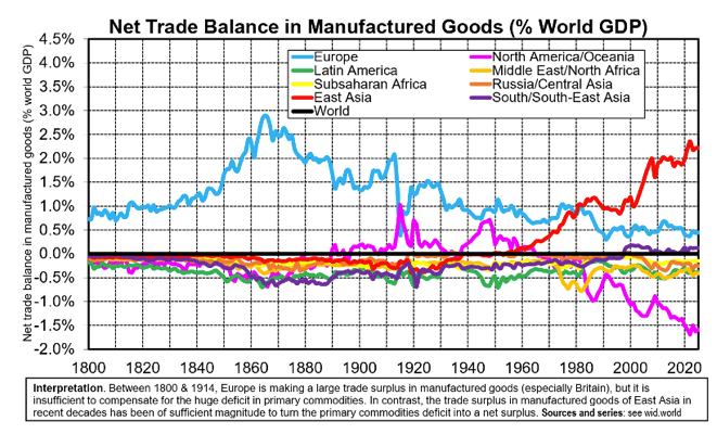 -با در نظر گرفتن این درک جایگزین از تولید جهانی، استدلال نویسندگان مبنی بر اینکه آسیای شرقی امروز قدرت تولیدی جهانی است و همتراز با اروپای امپریالیستی قرار دارد، نیز فرومیریزد. نویسندگان این استدلال را بر مشاهدهٔ خود مبنی بر اینکه مازاد تولیدی آسیای شرقی در دورهٔ ۱۹۶۰-۲۰۲۵ قابل مقایسه با اروپا در دورهٔ ۱۸۶۰-۱۹۱۴ است، بنا میکنند (به نمودار زیر مراجعه شود). این نوع مشاهده—که صرفاً بر مقایسهٔ گسترش کمی صادرات تولیدی مبتنی است—به طور کامل شیوهای را در بر نمیگیرد که اقتصاد سیاسی تولیدات صنعتی از موج اول جهانیسازی تا موج دوم، به طور بنیادین تحول یافته است.