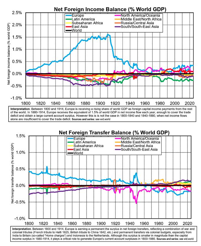 معمایی که سپس طرح میکنند این است که اروپا در فاصلهٔ سالهای ۱۸۰۰ تا ۱۹۱۴، با کسری پایدار تجاری کالاها روبرو بوده است. چگونه این امر با این مشاهده سازگار است که اروپا در همان دوره مازاد حساب جاری بسیار بالایی داشته است؟ طبق دادههای آنان، بریتانیا و دیگر کشورهای هستهٔ اروپایی در بخش خدمات، و مهمتر از آن، درآمدهای مثبت جریان مالی خارجی و انتقالات مالی خارجی، مازاد داشتهاند (به دو نمودار زیر مراجعه شود). آنان درمییابند که جریانهای ورودی درآمد خارجی—شامل سود سهام، بهره، حق امتیاز و سود حاصل از سایر نقاط جهان—به کشورهای هستهٔ اروپایی در دورهٔ ۱۸۸۰ تا ۱۹۱۴ به قدری عظیم بوده که هیچ کشور یا منطقهای در جهان از آن زمان تاکنون جریانهای ورودی درآمد خارجی با این حجم دریافت نکرده است. اروپا همچنین انتقالات مالی خارجی قابل توجهی دریافت میکرده که شامل انتقالات استعماری از قبیل خراجهای یکباره و انتقالات دولتی و خصوصی از مستعمرات به استعمارگران میشده است. نیواس و پیکتی سپس استدلال میکنند که در حالی که جریان انتقالات مالی خارجی در دورهٔ ۱۸۰۰ تا ۱۹۱۴ از جنوب به شمال بوده، در دهههای اخیر (۱۹۷۰-۲۰۲۵) جریان آن به سمت مخالف بوده است: یعنی از شمال به جنوب. این انتقالات دیگر شامل انتقالات استعماری نیستند، بلکه متشکل از جریانهای کمکهای دولتی و، مهمتر از همه، حوالههای خصوصی هستند که مهاجران مقیم در شمال جهانی به کشورهای جنوب جهانی میفرستند.