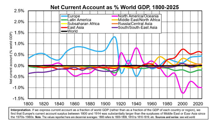 تفسیر: اگر حساب جاری را به عنوان کسری از GDP جهانی (نه GDP هر کشور یا منطقه) بیان کنیم، متوجه میشویم که مازاد حساب جاری اروپا بین سالهای ۱۸۰۰ تا ۱۹۱۴ به طور قابل توجهی بزرگتر از مازدهای خاورمیانه یا آسیای شرقی از دهه ۱۹۷۰ تا ۱۹۸۰ بوده است. توجه: مقادیر گزارش شده در اینجا میانگینهای دههای هستند (مثلاً سال ۱۸۰۰ به بازه ۱۸۰۰–۱۸۰۹، سال ۱۸۱۰ به بازه ۱۸۱۰–۱۸۱۹ و غیره اشاره دارد). منابع و سریهای داده: http://www.wid.world