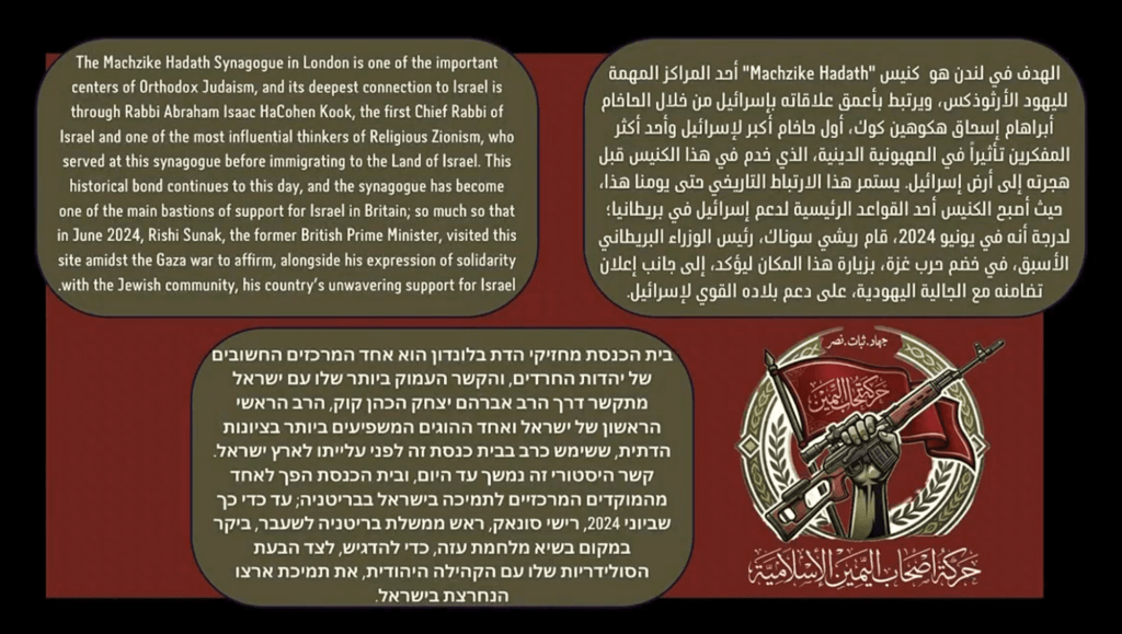 اگرچه این گروه مبهم مسئولیت آتش زدن آمبولانسهای متعلق به یک سازمان یهودی در لندن در ۲۳ مارس را بر عهده گرفت، دو مظنون این حمله با قرار وثیقه آزاد شدهاند و به هیچ جرم مرتبط با تروریسم متهم نشدهاند. افزون بر این، پلیس متروپولیتن لندن تاکنون از انتشار نام این مردان خودداری کرده و پرسشهایی را درباره هویت آنان مطرح ساخته است. آیا آنان اساساً مسلمان بودند؟