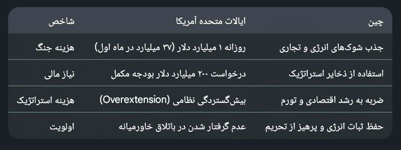 این بحران نشاندهندهٔ تفاوت ماهوی منافع این دو قدرت بزرگ در نتیجهٔ جنگ است. در حالی که حضور نظامی آمریکا به دلیل پایگاهها و ناوگانهایش در خلیج فارس بسیار بالاست، حضور نظامی چین در کمترین سطح قرار دارد. در نتیجه، موقعیت استراتژیک آمریکا از نظر نظامی دچار «بیشگستردگی» (Overextension) شده، در حالی که چین از نظر اقتصادی آسیبپذیر است.