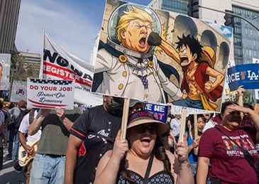 ۲۸ مارس، لسآنجلس. حدود ۱۰۰ هزار تن در اعتراض به سیاستهای مهاجرتی، اقتصادی، خارجی و توسعه فراقانونی قدرت اجرایی دولت ترامپ، در مرکز شهر شعار «نه به پادشاه» سر دادند.
