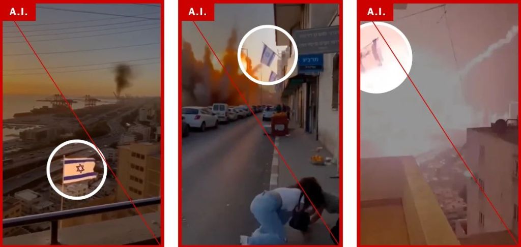 تصویرجعلی ویدئوهایی که پرچم اسرائیل را در پیشزمینه نشان میدهند، اغلب جعلی هستند.به گفته کارشناسان، ظاهر شدن پرچم اسرائیل در پیشزمینه، نشانه رایجی از ویدئوهای تولید شده توسط هوش مصنوعی است. ابزارهای هوش مصنوعی اغلب به طور خودکار جزئیات را هنگام وارد کردن توضیحات حملات موشکی توسط کاربران اضافه میکنند. در همین حال، ویدئوهای جنگ واقعی معمولاً کمتر دراماتیک هستند. موشکها اغلب فقط به صورت نقاط روشن دور یا ستونهای دود ظاهر میشوند.