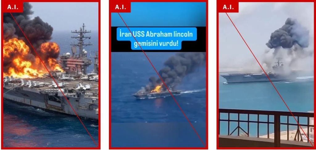 در یک مورد، محتوای جعلی تولید شده توسط هوش مصنوعی نقش مهمی در انتشار اطلاعات نادرست ایفا کرد. در ۱ مارس، نیروی دریایی ایران ادعا کرد که با موفقیت به ناو هواپیمابر CVN-72 ایالات متحده حمله کرده است و موجی از تصاویر جعلی تولید شده توسط هوش مصنوعی را به راه انداخت.بسیاری از کاربران ایرانی این ویدئو را به صورت آنلاین به اشتراک گذاشتند و ازآن استقبال کردند و آن را به عنوان مدرکی مبنی بر اینکه ضدحمله ایران در حال تضعیف است. با این حال، ایالات متحده بعداً ادعا کرد که حمله ناموفق بوده و کشتی آسیبی ندیده است.